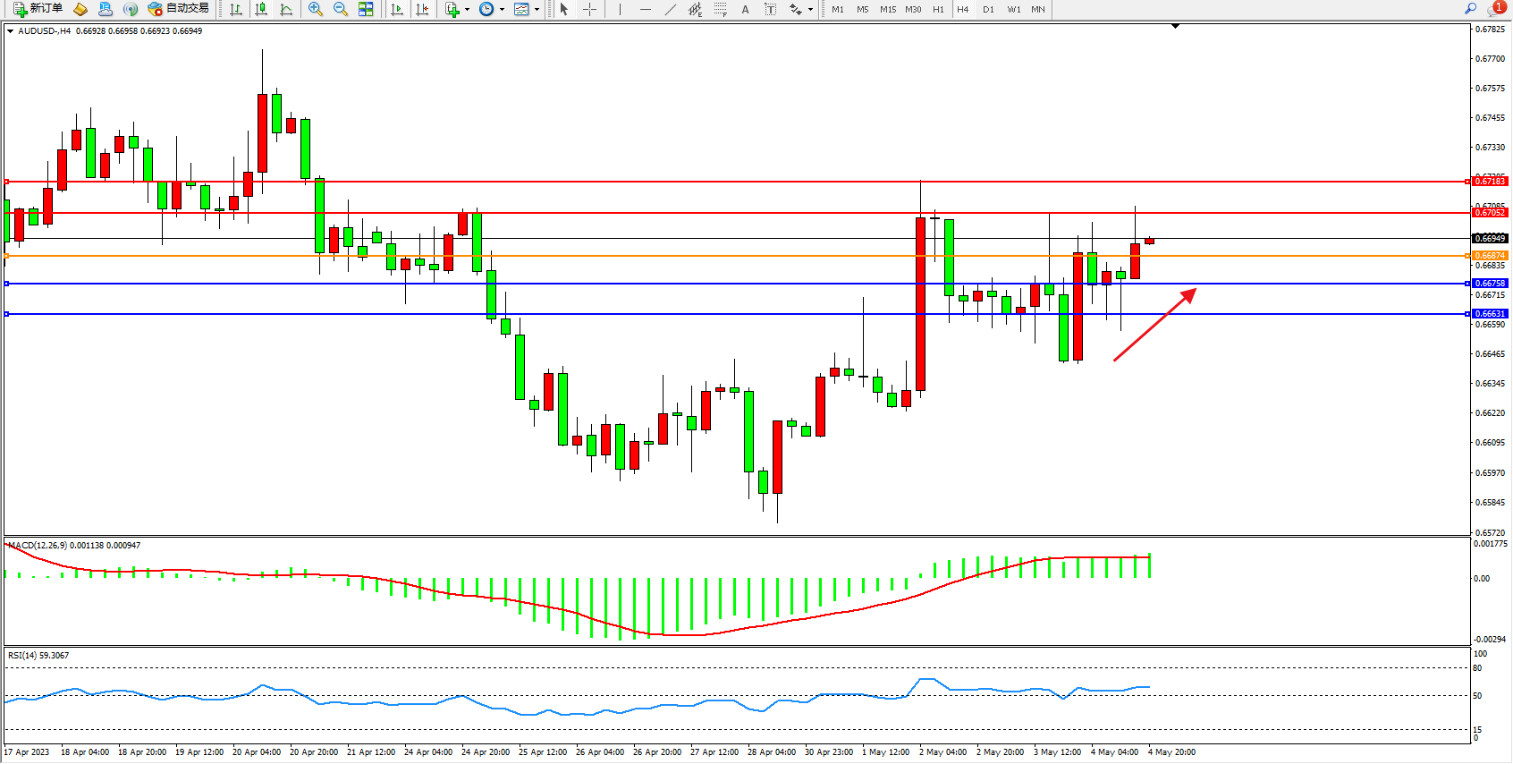交易策略:0.66874上方看涨,目标0.67052 0.67183