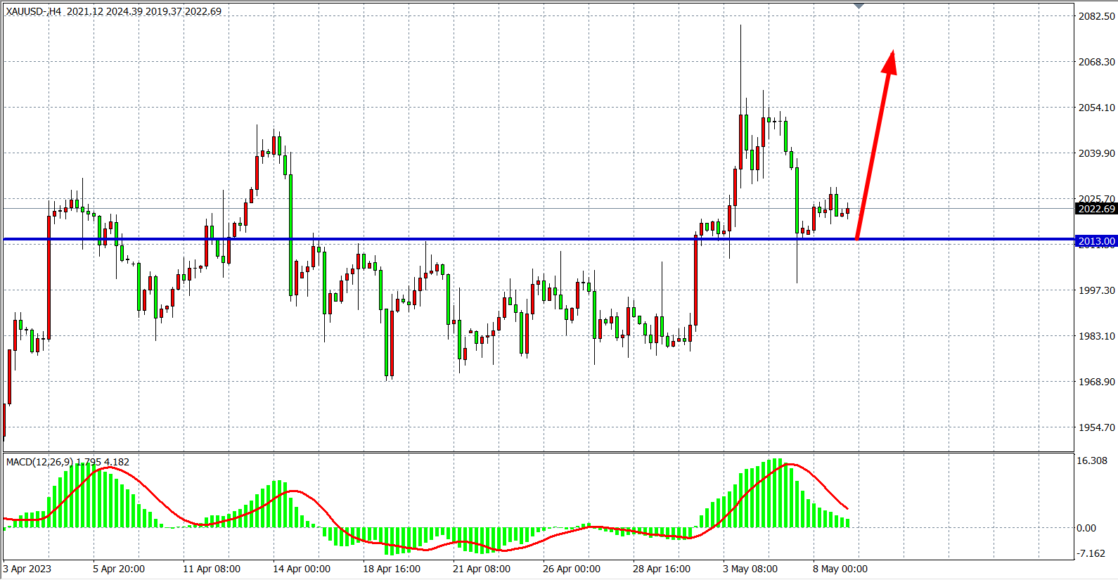 4小时图看,黄金在2000之上继续反弹,目前支撑进一步上移至2010附近,同时MAC在零轴附近缩量,有望重新蓄势上涨,日内在2013之上看涨,目标2040-2060附近。
