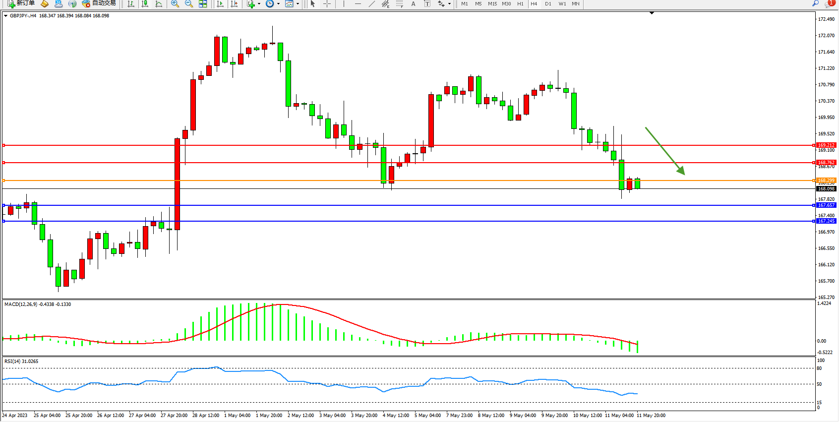交易策略:168.299下方看跌,目标167.657  167.245