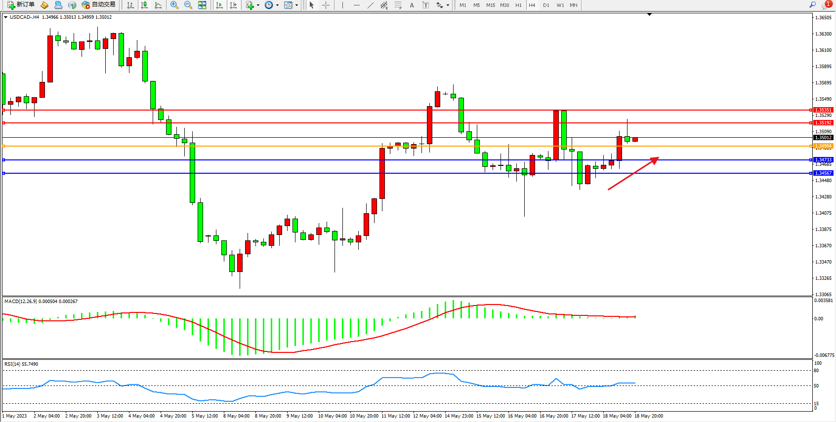 美元兑加元维持1.35012附近震荡,市场下调美联储6月暂停加息的预期导致美元走强,利空以美元计价的大宗商品价格。但油价隔夜录得逾3%涨势,受益于美国汽油库存大降,需求飙升至2021年以来的最高水平,美国债务上限谈判预期乐观,且俄罗斯发出与OPEC+相悖的论调,油价后市继续看涨。