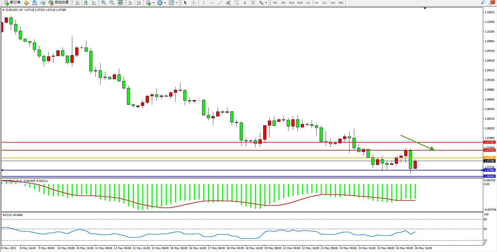 欧元美元EURUSD—4小时K线图显示: