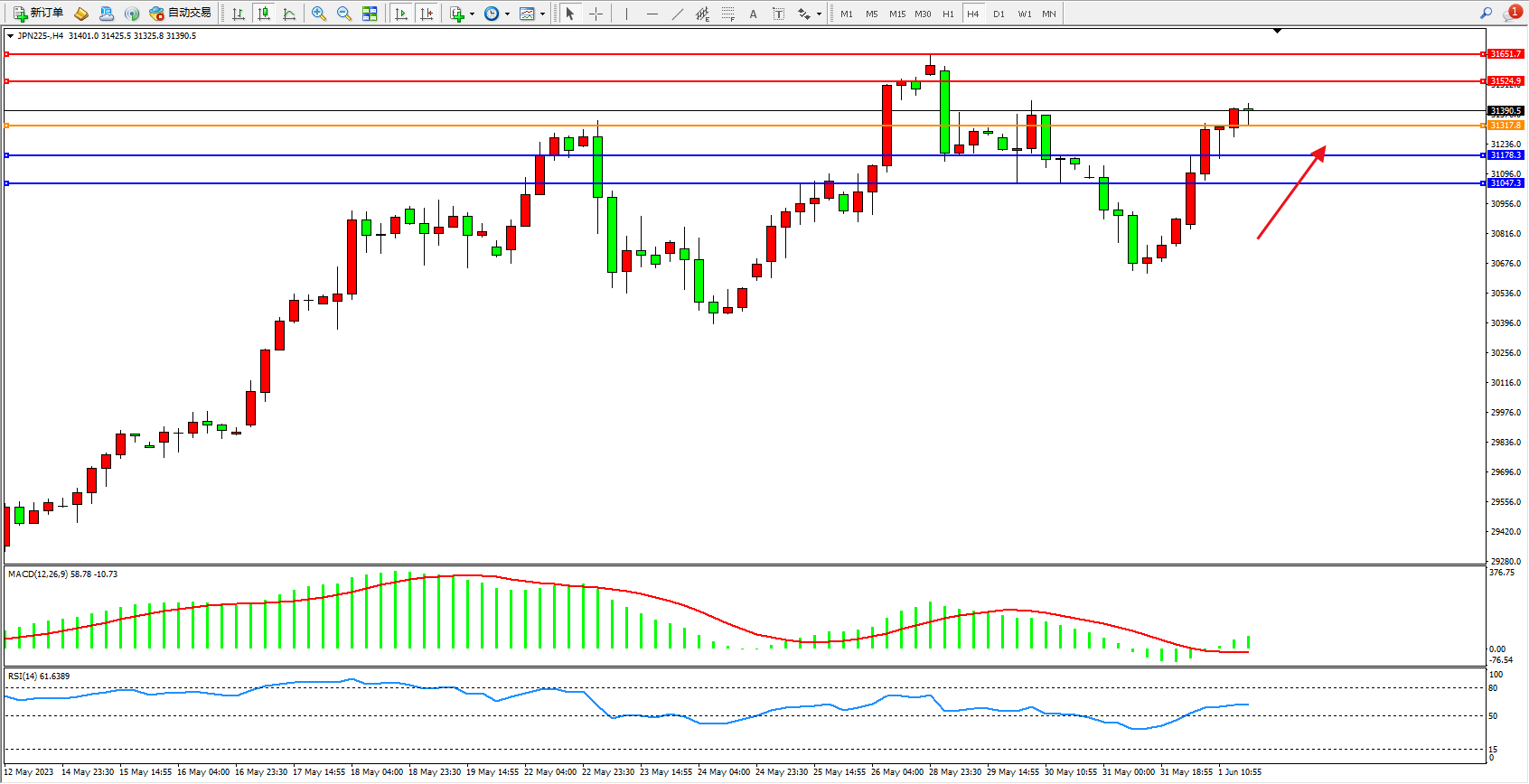 日经225指数6月1日(周四)收盘上涨234.62点,涨幅0.76%,报31122.50点。日本企业1-3月以2015年以来最快的速度增加了工厂和设备支出,汽车产量和芯片制造的复苏以及房地产领域的服务业投资带动了这一增长,反映出经济温和增长。