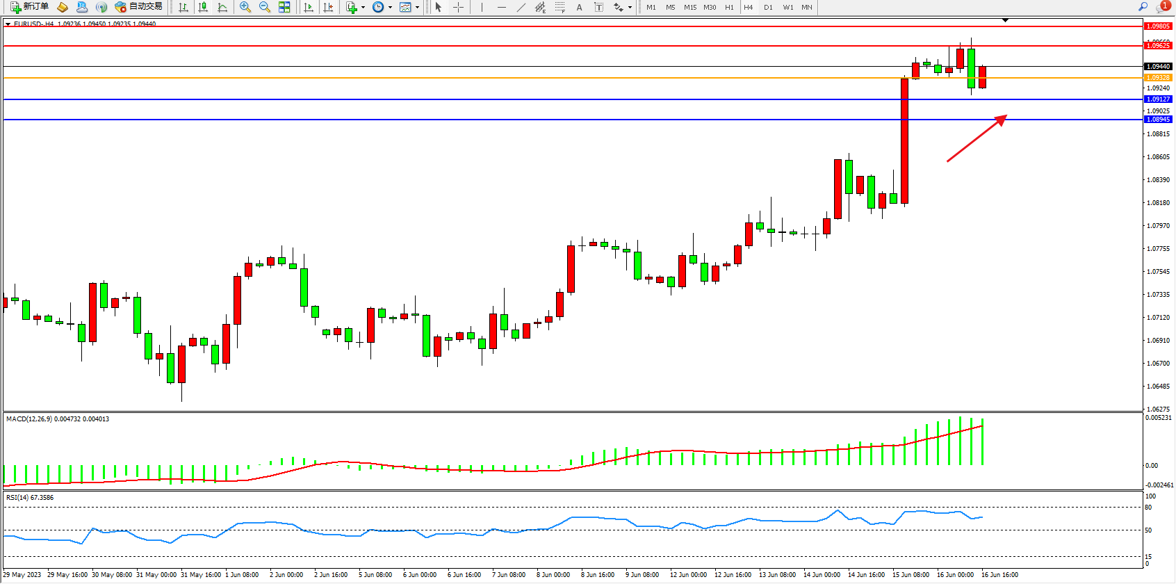 欧元美元EURUSD—4小时K线图显示: