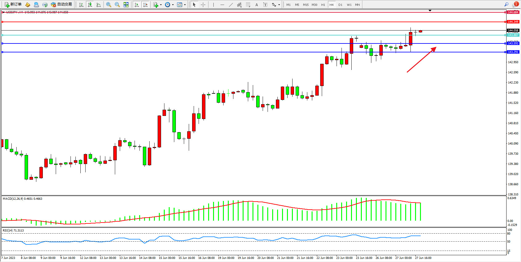 4小时图看:高位多头动力维持整理缓慢上行,市场看涨情绪依旧,短期有继续向上移动态势,MACD指标处于多头区域维持整理,RSI指标处于多头区域高位震荡;