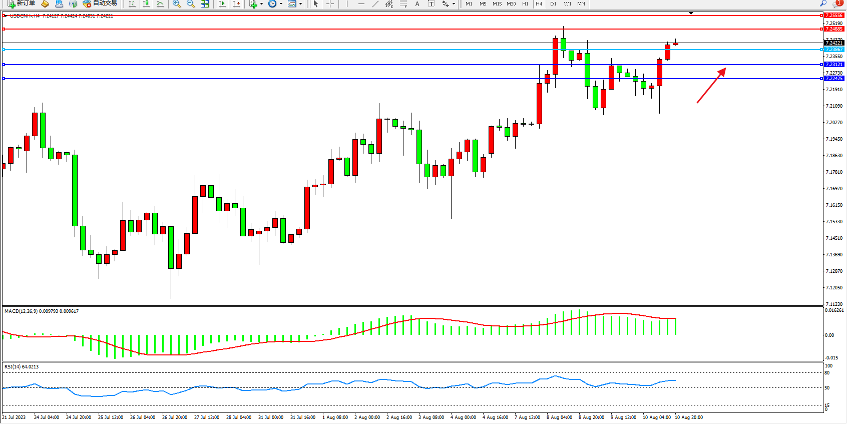 交易策略:7.23867上方看涨,目标7.24885 7.25556