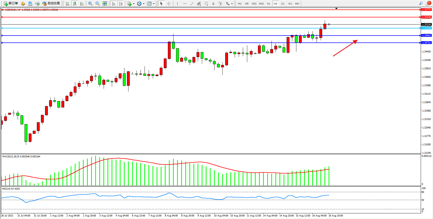 4小时图看:高位多头动力维持震荡上行,短期看涨情绪笼罩,市场多头不断上移,MACD指标处于多头区域高位整理,RSI指标处于多头区域徘徊;