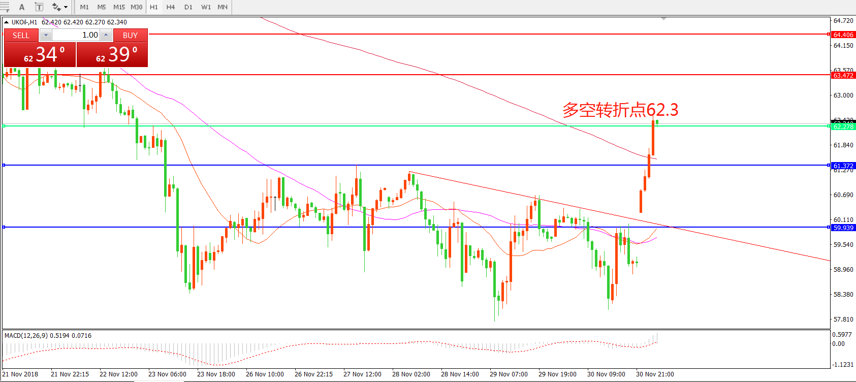 小时图看,油价收G20利好消息影响,跳空高开并站稳前期阻力61.2,整体走势偏强,MACD绿柱缩短,红柱增加,短期以反弹做多思路对待。
