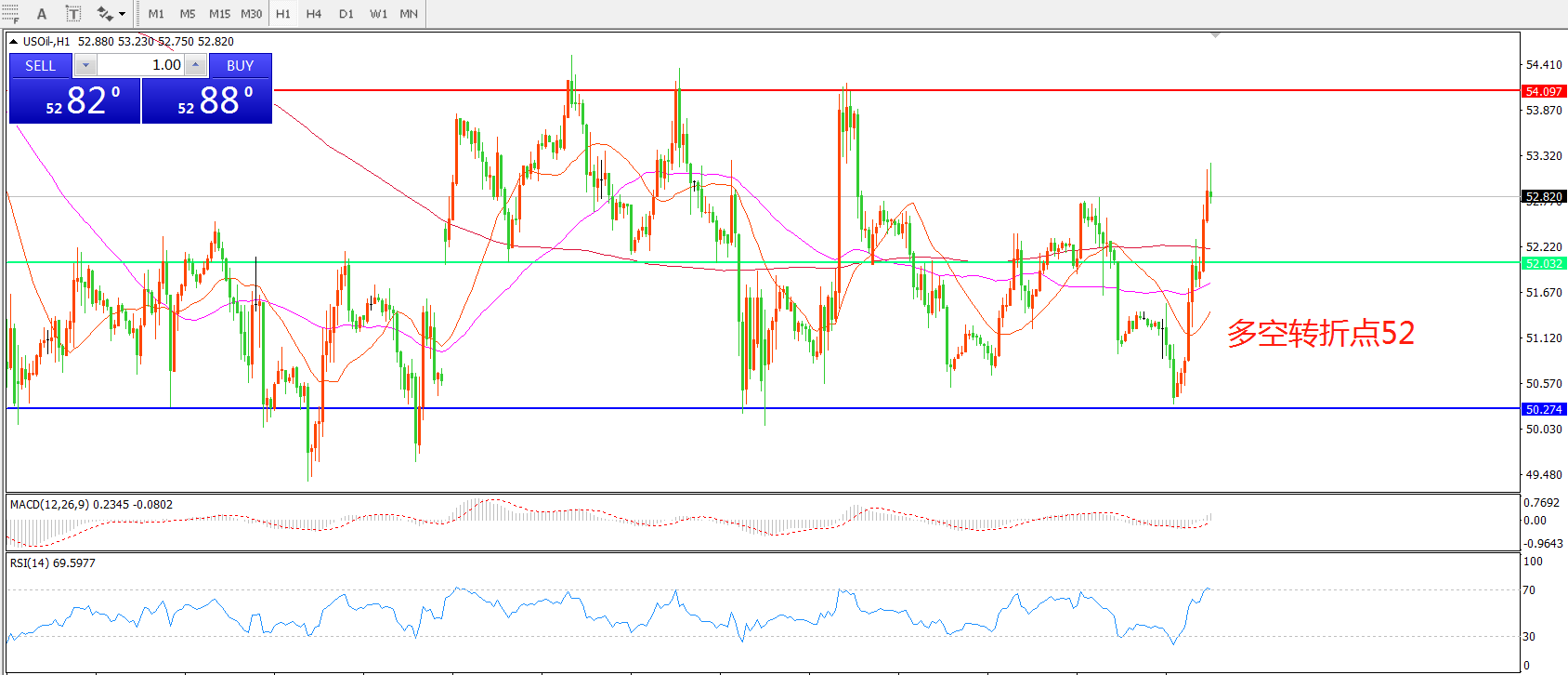 小时图看,油价触及50美元附近后强势反弹,整体价格再次回到52美元之上,均线系统逐渐粘合,,MACD红柱增加,日内仍以整理走势为主。