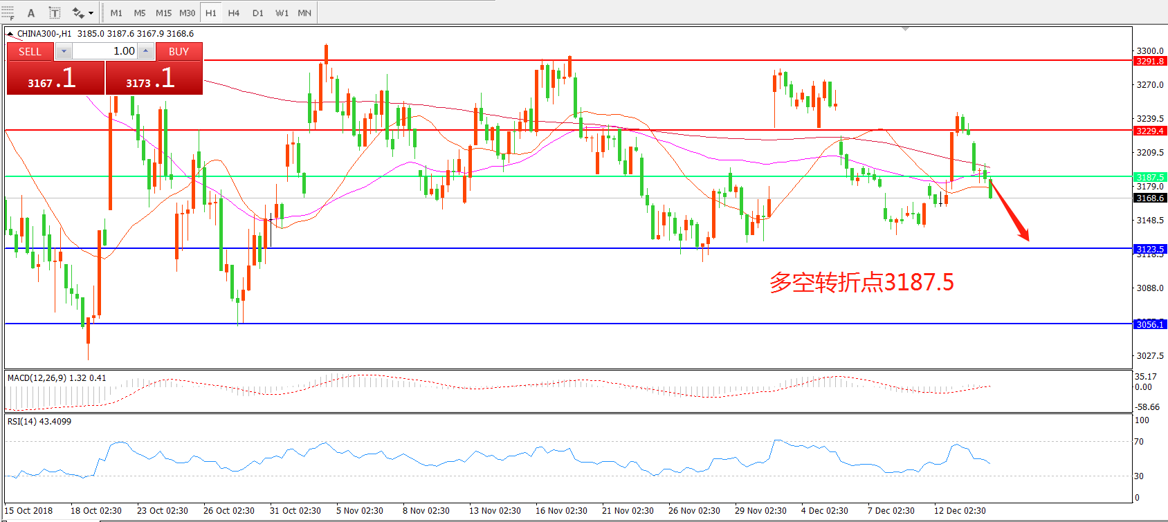 1小时图看,CHINA300中华指数连续收阴,整体价位跌至3187.5之下, 均线系统逐渐粘合,MACD绿柱缩短,RSI指标向下,日内走势仍以箱型整理为主。