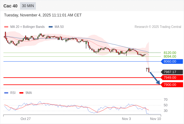 Cac 40 当日内: 下跌趋势。