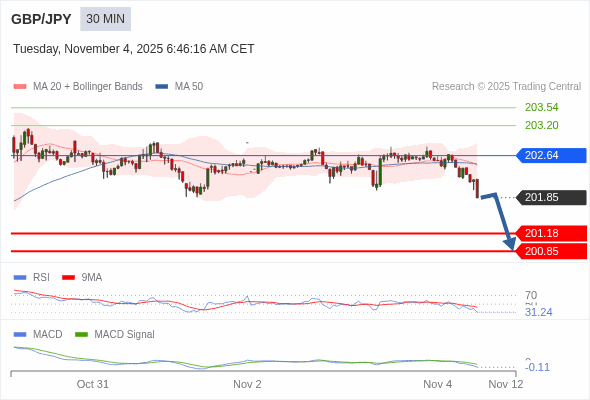 英镑/日元 当日内 : 看跌,在 202.64 之下。