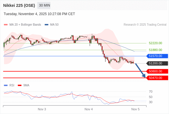 在 51570.00 之下,看跌,目标价位为 50800.00 ,然后为 50470.00 。