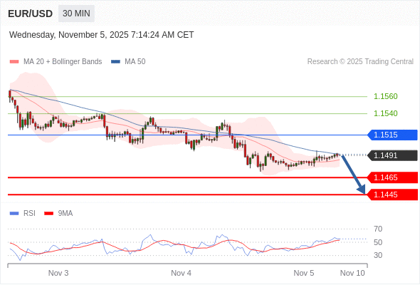 在 1.1515 之下,看跌,目标价位为 1.1465 ,然后为 1.1445 。