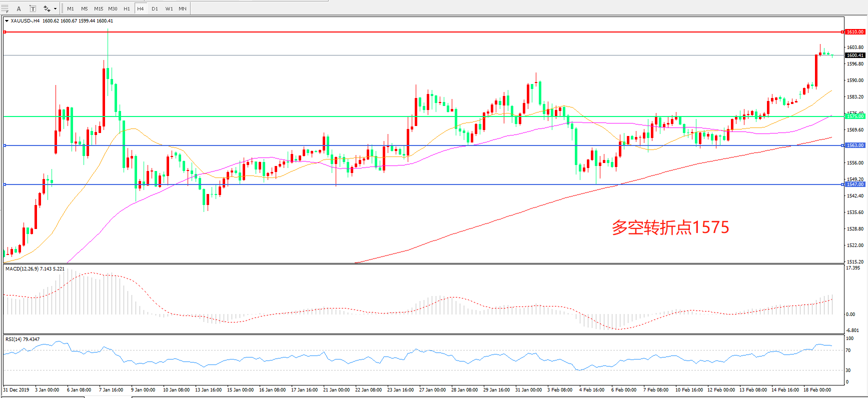 4小时图看,金价长阳拉升,突破1600关口,整体走势偏强,均线系统拐头向上, MACD红柱增加,RSI指标走平,日内延续上行概率较大。
