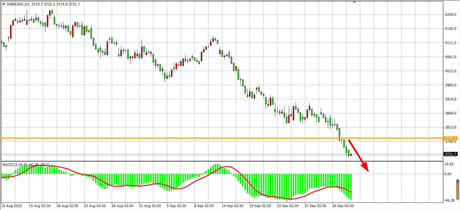 1小时图看,沪深300在跌破3820支撑后进入加速下跌,同时MACD在零轴之下持续急速缩量,显示趋势延续下跌,目前支撑已下移3780附近,日内在该位之下继续看下跌为主,下方目标看3700-3660。