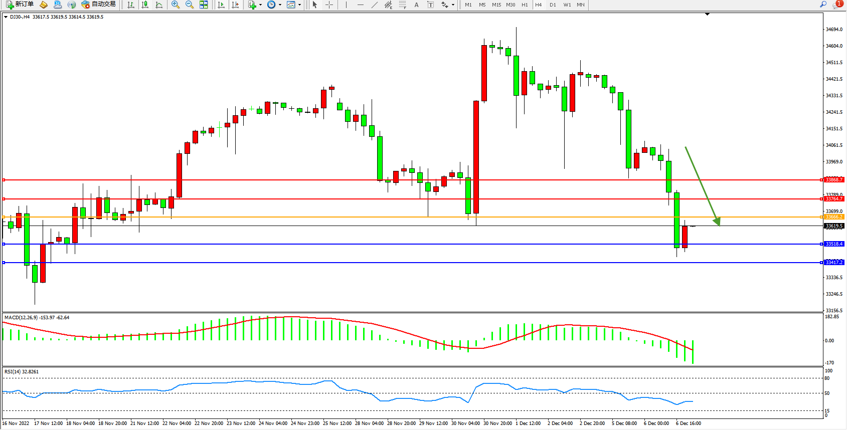 道琼斯指数12月6日(周二)收盘下跌351.02点,跌幅1.03%,报33596.08点;美国10月贸易逆差大幅扩大,因全球需求放缓和美元走强打压出口。这是美联储为抗击通胀而进行的自上世纪80年代以来最快的加息周期的结果。