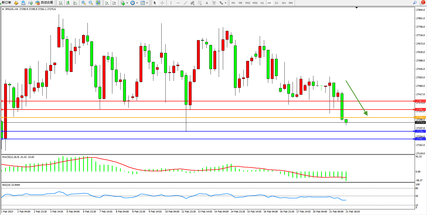 日经225指数2月21日(周二)收盘下跌72.44点,跌幅0.26%,报27459.50点。日本2月制造业活动以30个月来最快速度萎缩,对于日本经济来说是一个令人担忧的迹象。目前日本经济面临需求减弱和成本压力的问题。