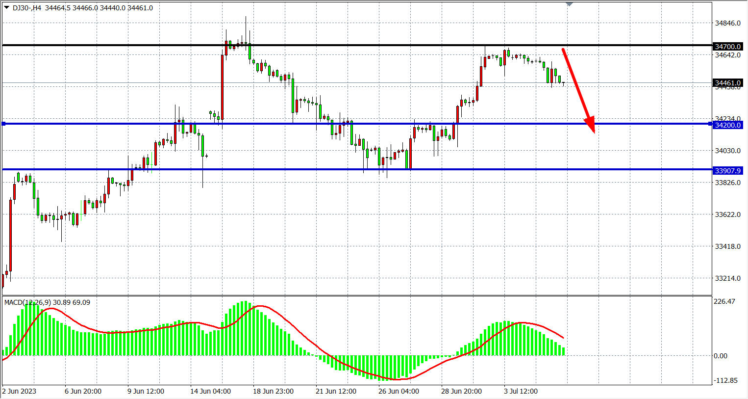 交易策略:34700 下方看跌,目标 34200 33900