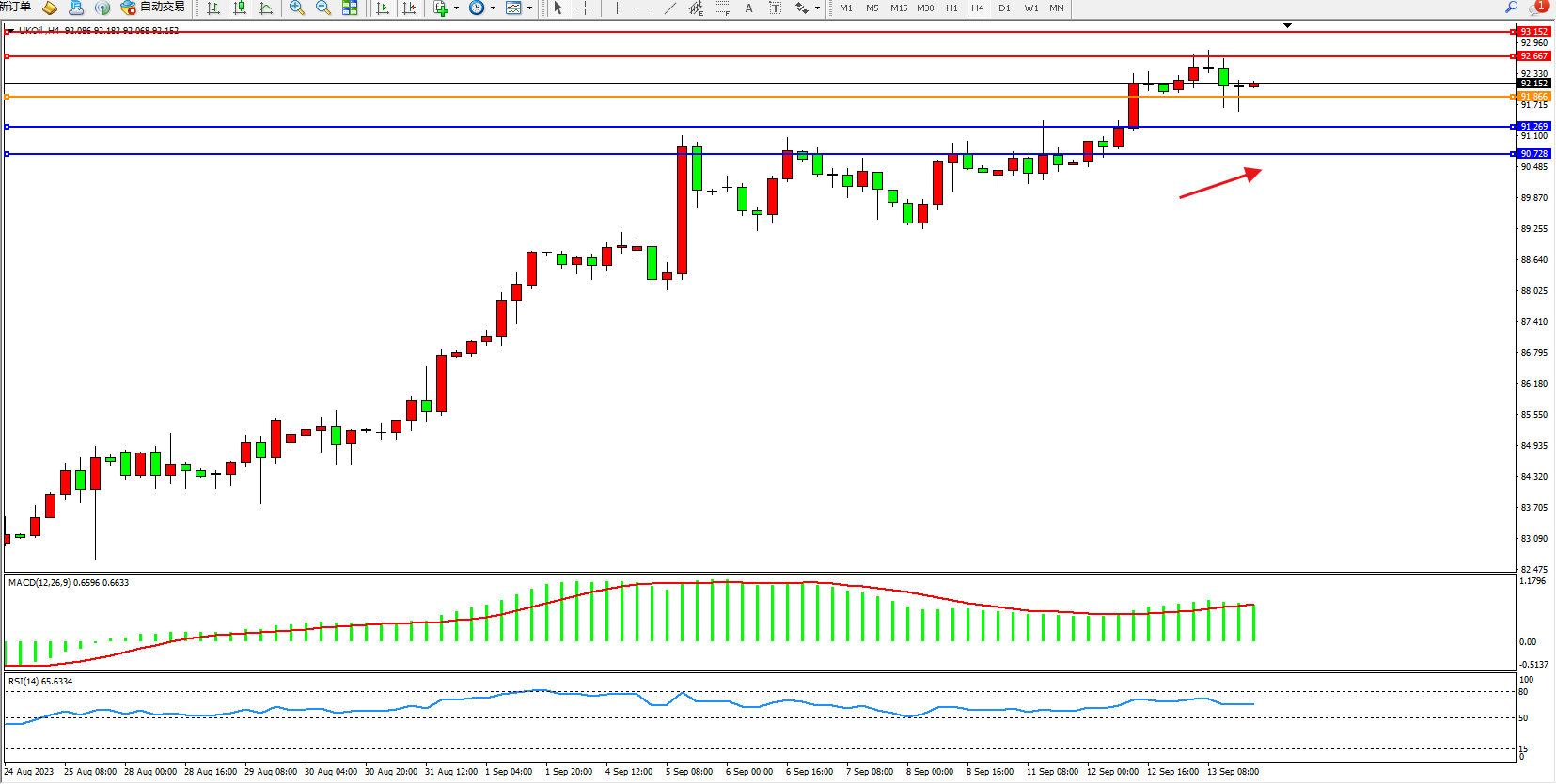 4小时图看:多头动力高位维持整理上移,短期看涨情绪持续,市场多头不断攀升中,MACD指标处于多头区域维持整理,RSI指标处于多头区域维持震荡;