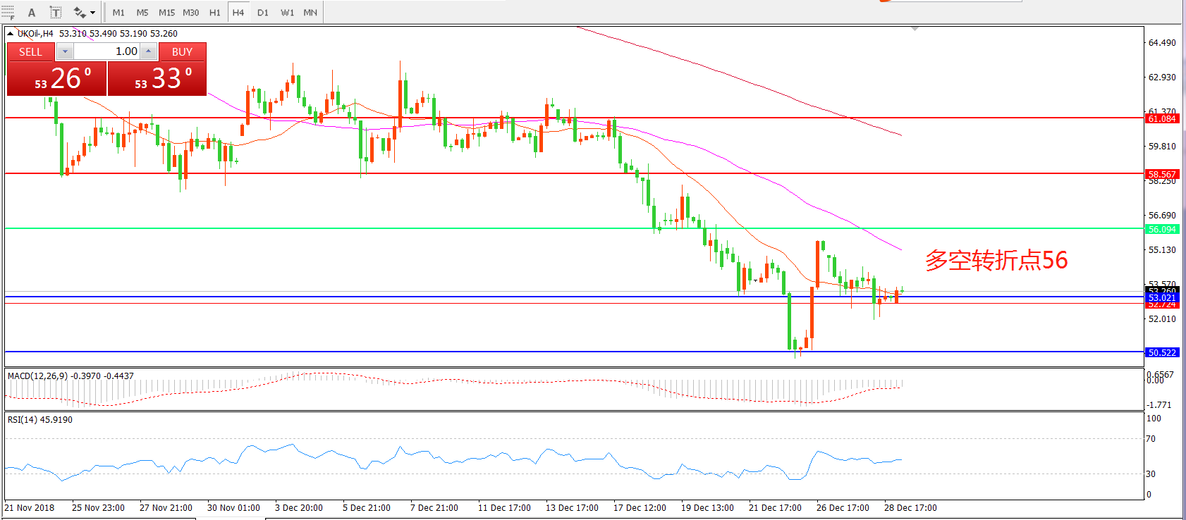 4小时图看,油价触及50美金后出现反弹,突破53美元后暂时企稳,但均线系统仍呈空头排列,MACD绿柱缩短,短期走势以震荡偏空思路对待。