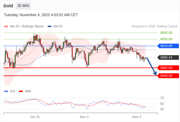 在 4014.00 之下,看跌,目标价位为 3962.00 ,然后为 3943.00 。